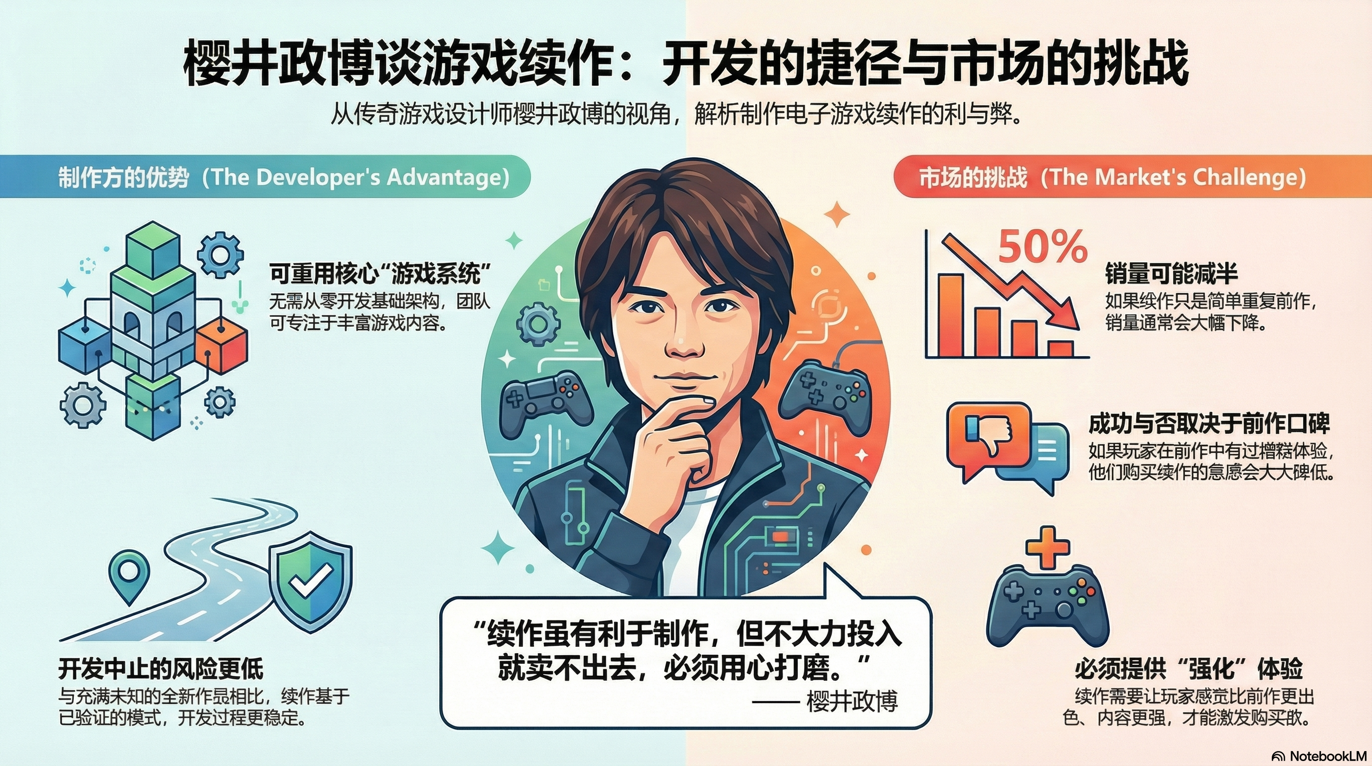 樱井首先提出了一个冷峻且令人惊讶的论断:如果一部续作仅仅是初代作品的简单复刻,那么开发者应该做好销量减半的心理准备。对于风格怪异或小众的游戏来说,情况尤为如此。这一数据直接粉碎了“续作即是票房保障”的幻想。它建立了一个充满挑战的基准线,迫使创作者必须通过重大改进来证明续作存在的价值,而非躺在功劳簿上吃老本。
